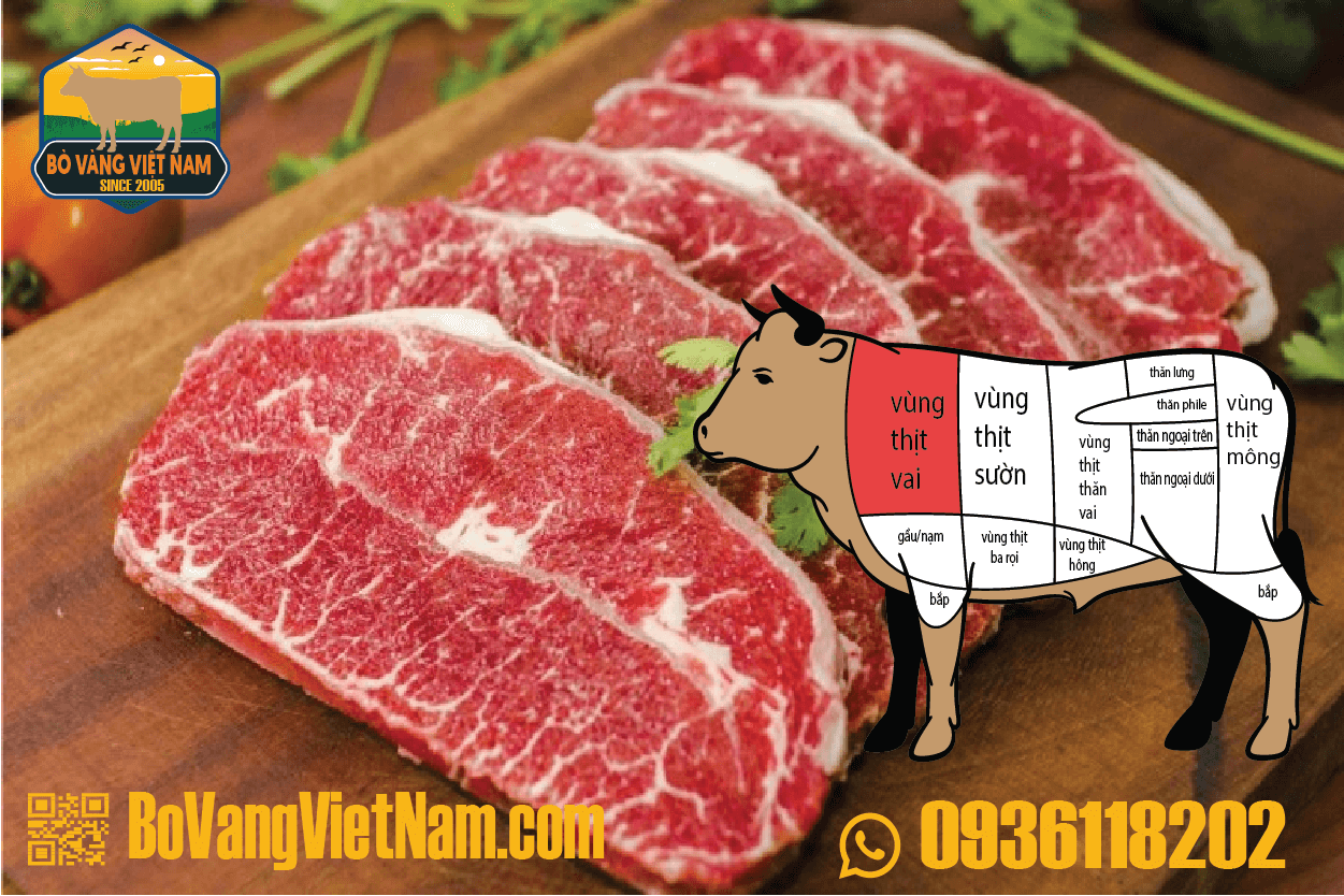 Đây là phần được cắt từ phần xương vai bò, thịt vai bò thường là có hình chữ nhật với độ dày gần 3cm. Ngoài ra, thịt vai còn được gọi là “miếng bò xương số 7” bởi hình dạng của xương vai có mặt cắt ngang giống với chữ số ‘7’. Phần thịt này thường dai hơn các phần thịt khác bởi thịt vai là nơi có nhiều mô nối.